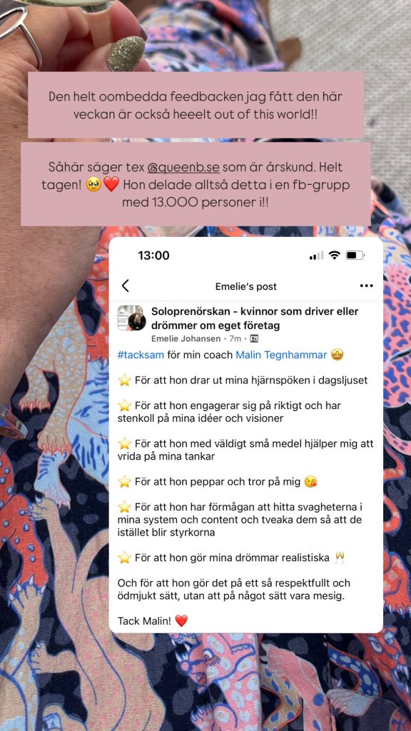 Malin är otroligt lyhörd och det är oerhört uppfriskande att hon snabbt ville konkretisera mina framtidsdrömmar med tydliga handlingsplaner. Flera av hennes råd har redan visat sig fungera mycket bra och det säger väl egentligen allt. Exakt det där man önskar av en riktigt grym coach.”